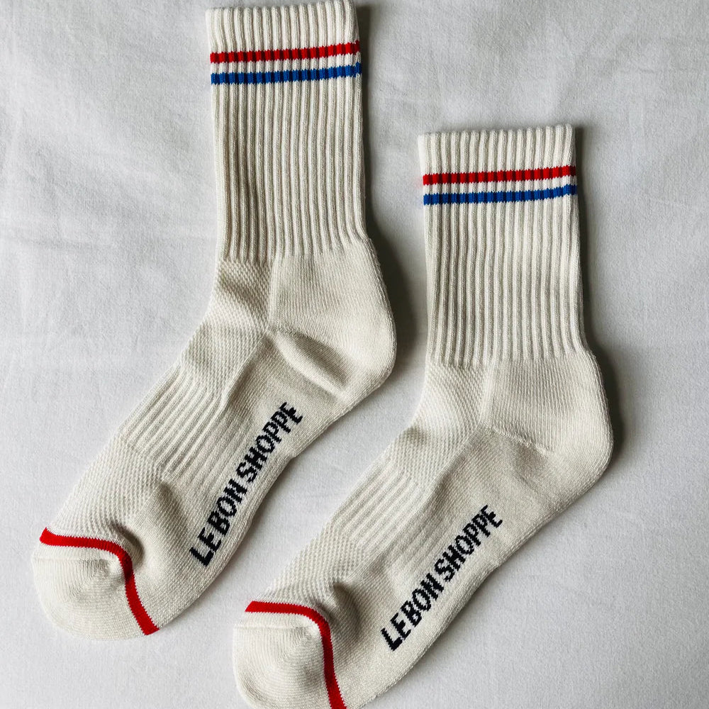 A signature style and year-round bestseller - the Boyfriend Socks capture a sporty vintage charm made for everyday wear. This slightly longer-than-crew sock features a contrast double stripe, mesh along the top of the foot for breathability, and elastic arch support. Durable, comfortable, and perfect for pairing with any shoe.