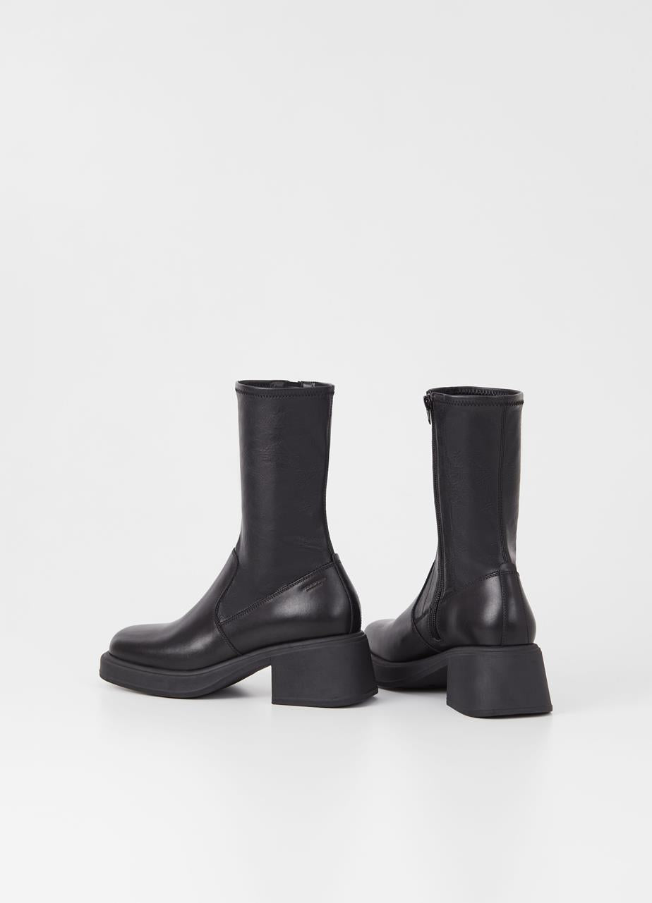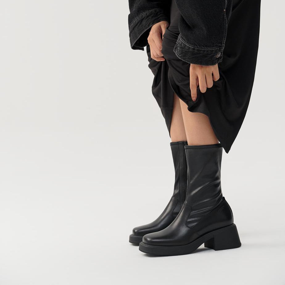 Dorah is the mid-rise stretch boots with a contemporary look. The style is crafted in a combination of black leather and synthetic leather, with a stretchy shaft, square toes and zip-side fastening. The solid block heels measure 59mm.