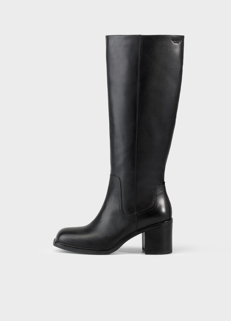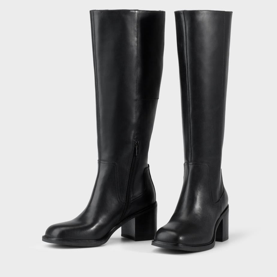 Meryl balances feminine elegance with casual edge. The tubular boot is made from black leather, featuring decorative stitching and a rounded toe shape.