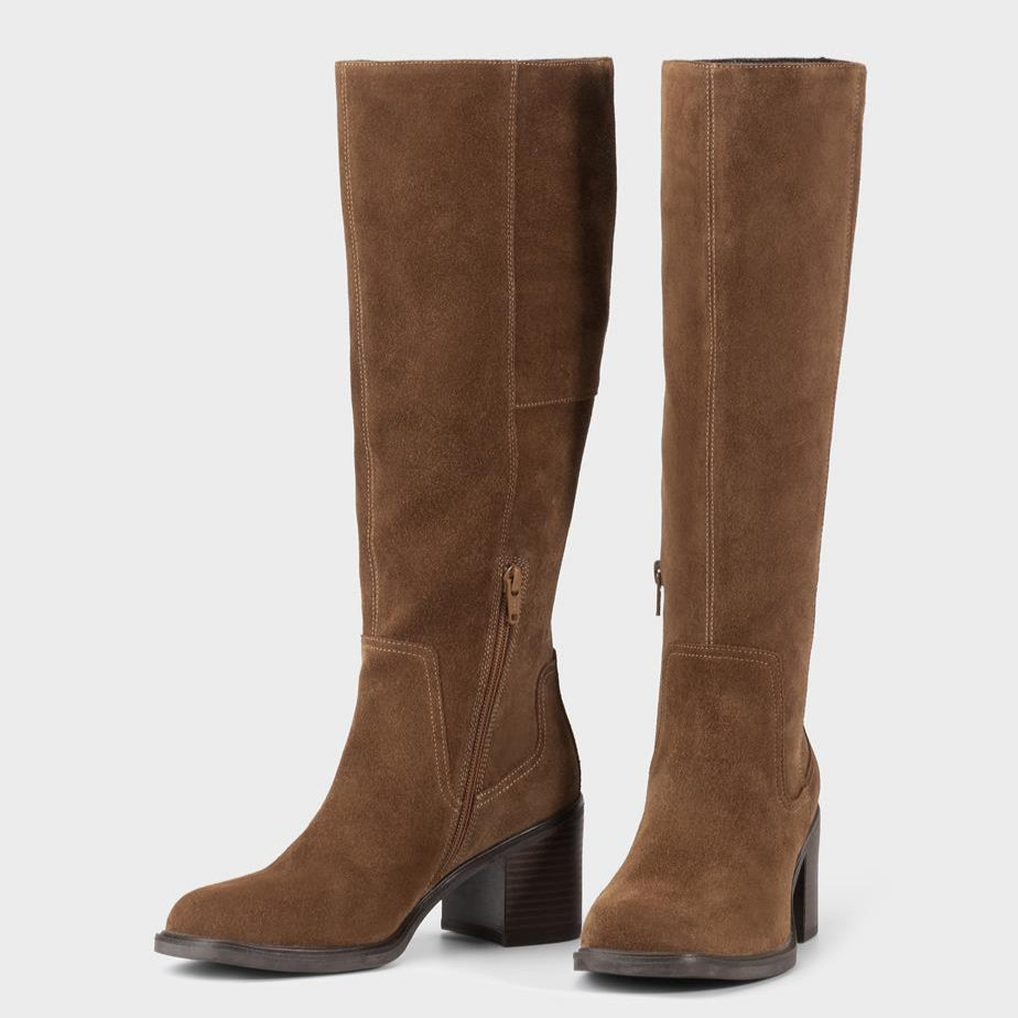 Meryl balances feminine elegance with casual edge. The tubular boot is made from brown suede, featuring decorative stitching and a rounded toe shape.