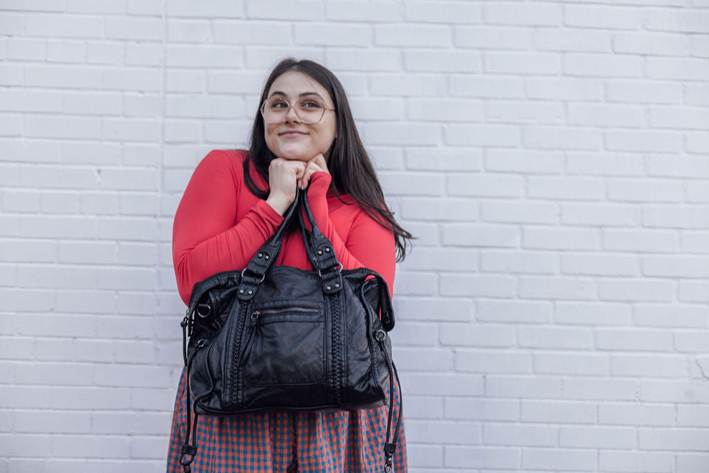 Our best selling bag is finally availble on line. Buttery soft washed vegan leather, well sized can accomodate laptops and gym clothes while looking effortlessly cool.